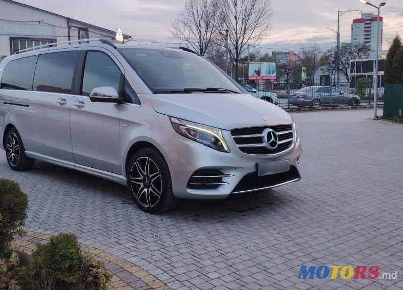 Mercedes-Benz V-Class W447, silver minivan, black leather interior, electrically adjustable seats, multimedia system, panoramic sunroof, alloy wheels, LED headlights, tinted windows, excellent condition.
